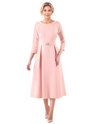Sukienka z ozdobnymi rękawami 15190, modna kreacja w pudrowym kolorze.