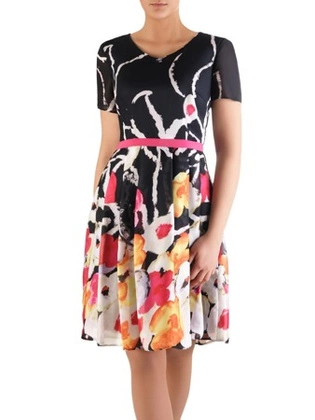 Trapezowa sukienka z szyfonu, zwiewna kreacja w kwiaty 32811