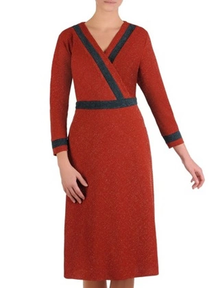Liczba produktów: 3366Kopertowa sukienka z kontrastowymi lamówkami 18742, ruda kreacja z dzianiny.
