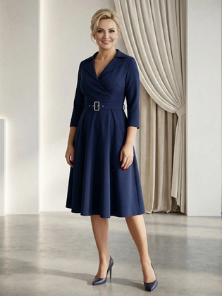 Liczba produktów: 3366Rozkloszowana sukienka z modnym kołnierzem, elegancka granatowa kreacja z paskiem 14659
