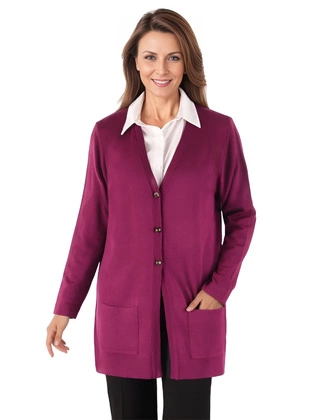 Liczba produktów: 1660Sweter damski fuksja z kieszeniami – kardigan z dekoltem w serek, idealny na jesień, zimę 40503