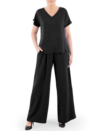 Liczba produktów: 1461Czarny komplet damski, luźne spodnie z bluzką w dekolt serek 38480