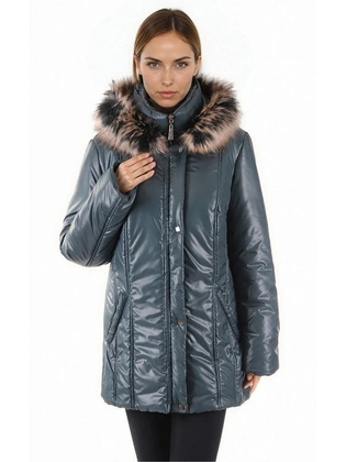 Kurtka zimowa damska, długa pikowana kurtka z kapturem i odpinanym futerkiem, grafitowa, duże rozmiary 38834