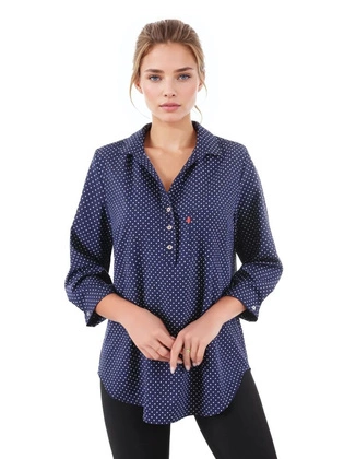 Koszula damska w groszki, granatowa bluzka koszulowa z kieszonką 38047