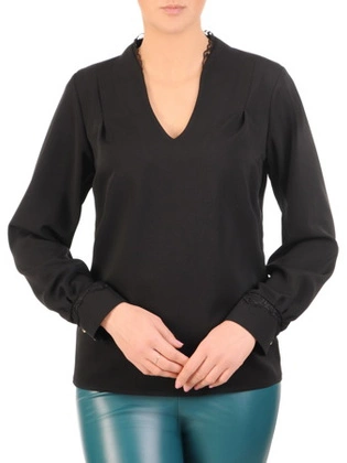 Czarna bluzka z ozdobną broszką i podwijanymi rękawami 37372