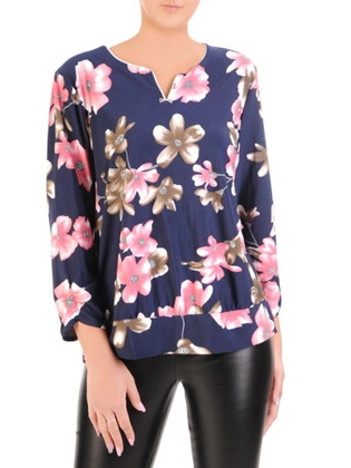Granatowa bluzka w kwiaty z ozdobnie wyciętym dekoltem 31771