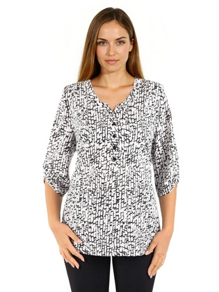 Bluzka plus size z wiskozy w geometryczny wzór – wygodna bluzka z marszczeniem na rękawach 40814
