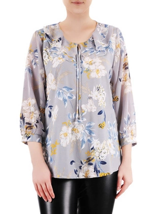 Wzorzysta bluzka damska z falbanami przy dekolcie 35900