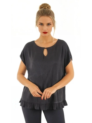 Bluzka damska plus size, czarna z ozdobną falbaną i wycięciem przy dekolcie 38484