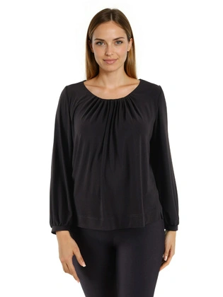 Czarna bluzka damska z marszczeniem – elegancka dzianinowa bluzka z okrągłym dekoltem 41018