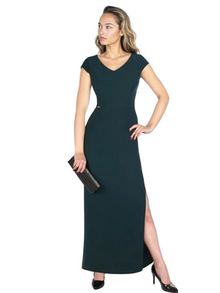 Zielona suknia z efektownym rozcięciem 18290, nowoczesna kreacja wieczorowa.