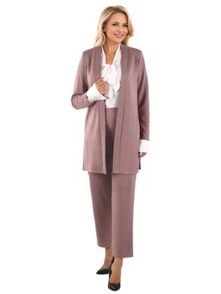 Elegancki komplet damski mokka – modny zestaw ze spodniami i narzutką 40480