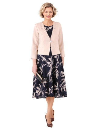 Elegancki komplet damski na wesele, komunię – sukienka w kwiaty z gładkim żakietem na jeden guzik, stylowy i szykowny zestaw 39634