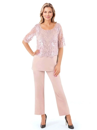 Komplet damski na wesele, komunię, pudrowa asymetryczna tunika ze spodniami 37999