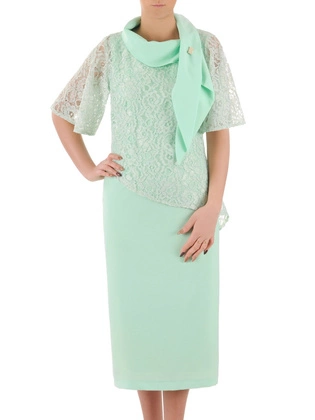 Dwuczęściowy komplet wizytowy 19506, zielona sukienka z krótkim bolerkiem.