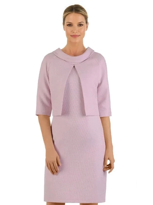 Kostium damski, pudrowa sukienka z koronkowym, połyskującym żakietem 36442