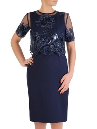 Elegancka sukienka z koronkowym bolerkiem 19366, granatowa kreacja na wesele.