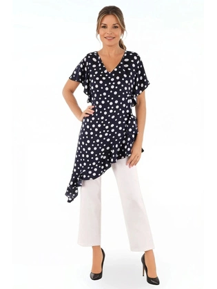 Komplet damski na wesele, komunię, asymetryczna tunika w groszki z białymi spodniami 38251