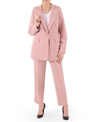Elegancki pudrowy komplet, spodnie z żakietem z ozdobnym guzikiem 37540