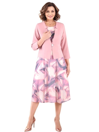 Elegancki komplet damski na wesele i komunię – rozkloszowana sukienka z pudrowym żakietem 39847