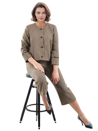 Komplet damski beżowo-brązowy w pepitkę – elegancki żakiet z guzikami i spodnie wizytowe 40307