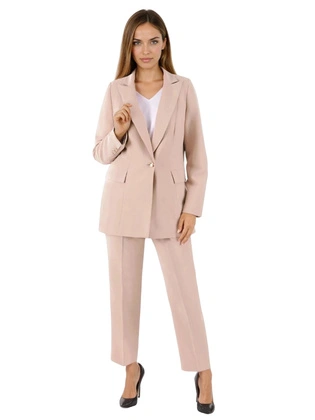 Elegancki beżowy komplet, spodnie z żakietem z ozdobnym guzikiem 37539