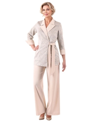 Modny komplet damski w odcieniach beżu i złota – elegancka stylizacja z tuniką i szerokimi spodniami 39945