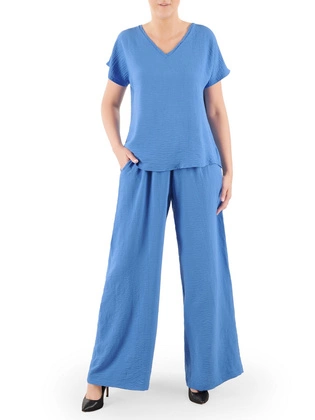 Niebieski komplet damski, luźne spodnie z bluzką w dekolt serek 38482