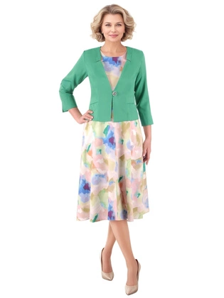 Elegancki komplet damski na wesele, komunię – sukienka w kwiaty z gładkim żakietem na jeden guzik, stylowy i szykowny zestaw 39635