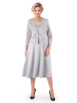Elegancki komplet damski na wesele, komunię – rozkloszowana sukienka w modnej kolorystyce z gładkim żakietem, stylowy i kobiecy zestaw 39633