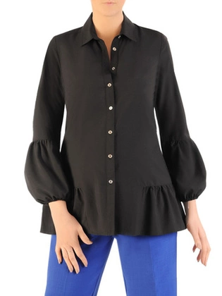 Czarna, koszulowa bluzka z ozdobnymi rękawami i falbaną 34737