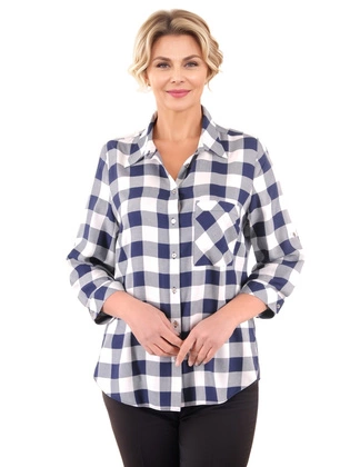 Granatowo-biała koszula damska w kratę z wiskozy – rękaw 3/4 z możliwością podwinięcia 39778