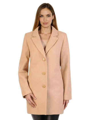 Płaszcz damski zimowy, beżowy płaszcz z dodatkiem wełny, wykończenie ekoskóra, klasyczny kołnierz, duże rozmiary 34130