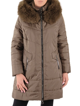 Kurtka zimowa damska, elegancka ciemnobeżowa kurtka pikowana z kapturem i odpinanym futerkiem, duże rozmiary 38621