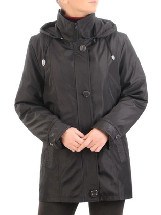 Płaszcz damski zimowy, czarny płaszcz zapinany na guziki, boczne kieszenie, kaptur 36416