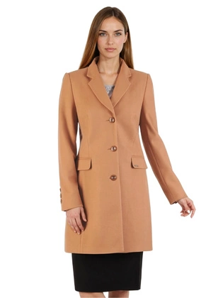 Beżowy klasyczny płaszcz damski przejściowy – elegancki fason z kołnierzem 39433