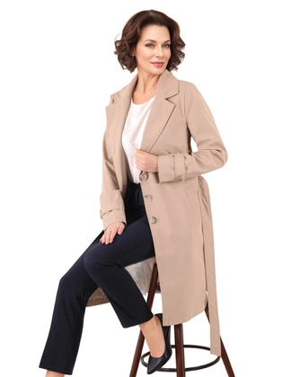 Płaszcz damski przejściowy – klasyczny beżowy płaszcz z kołnierzem i kieszeniami 39410
