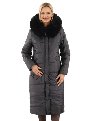 Kurtka zimowa damska, długa pikowana kurtka z kapturem i odpinanym futerkiem, czarna, duże rozmiary 38833