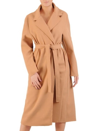 Płaszcz damski przejściowy, długi, beżowy płaszcz z kołnierzem, wiązanie w pasie, kieszenie 32602