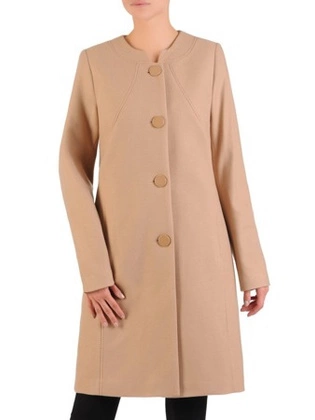 Płaszcz damski przejściowy, beżowy płaszcz zapinany na guziki, kołnierz typu stójka, boczne kieszenie 27102
