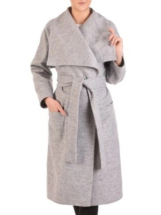 Płaszcz damski z dodatkiem wełny, przejściowy, elegancki, szary płaszcz z dużym wykładanym kołnierzem, boczne kieszenie 29011