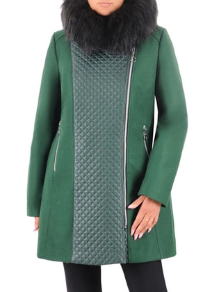 Płaszcz zimowy damski, zielony płaszcz z odpinanym kapturem obszytym futrem, duże rozmiary 36648