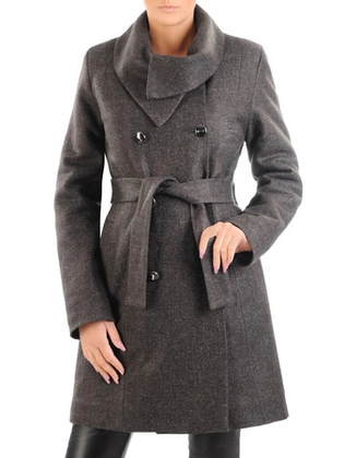 Płaszcz zimowy damski, dwurzędowy grafitowy płaszcz z oryginalnym kołnierzem, zapinany na guziki, pasek, duże rozmiary 34112