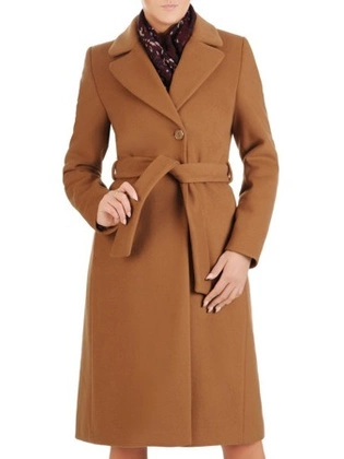 Płaszcz damski zimowy z dodatkiem wełny, elegancki camelowy płaszcz z klasycznym kołnierzem, pasek 27792