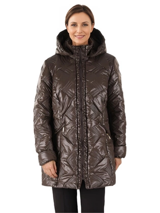 Długa brązowa kurtka damska pikowana z kapturem – klasyczna kurtka zimowa z zamkiem i stójką 40647