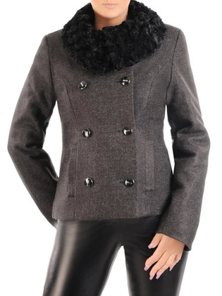 Kurtka zimowa damska, grafitowa krótka wełniana kurtka z ozdobnym kominem, duże rozmiary 34127