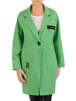 Płaszcz damski przejściowy, zielony, dzianinowy płaszcz z kołnierzem, ozdobny guzik, aplikacje, kieszenie, idealny na wiosnę, jesień 33141