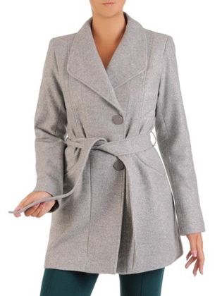 Płaszcz damski z dodatkiem wełny, przejściowy, elegancki, szary płaszcz z dużym wykładanym kołnierzem, boczne kieszenie 29011