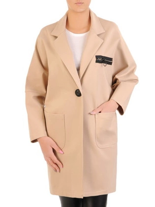 Płaszcz damski przejściowy, beżowy, dzianinowy płaszcz z kołnierzem, ozdobny guzik, aplikacje, kieszenie, idealny na wiosnę, jesień 33142