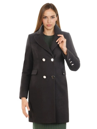 Trencz damski, klasyczny czarny płaszcz typu trencz z dwurzędowym zapięciem 34132